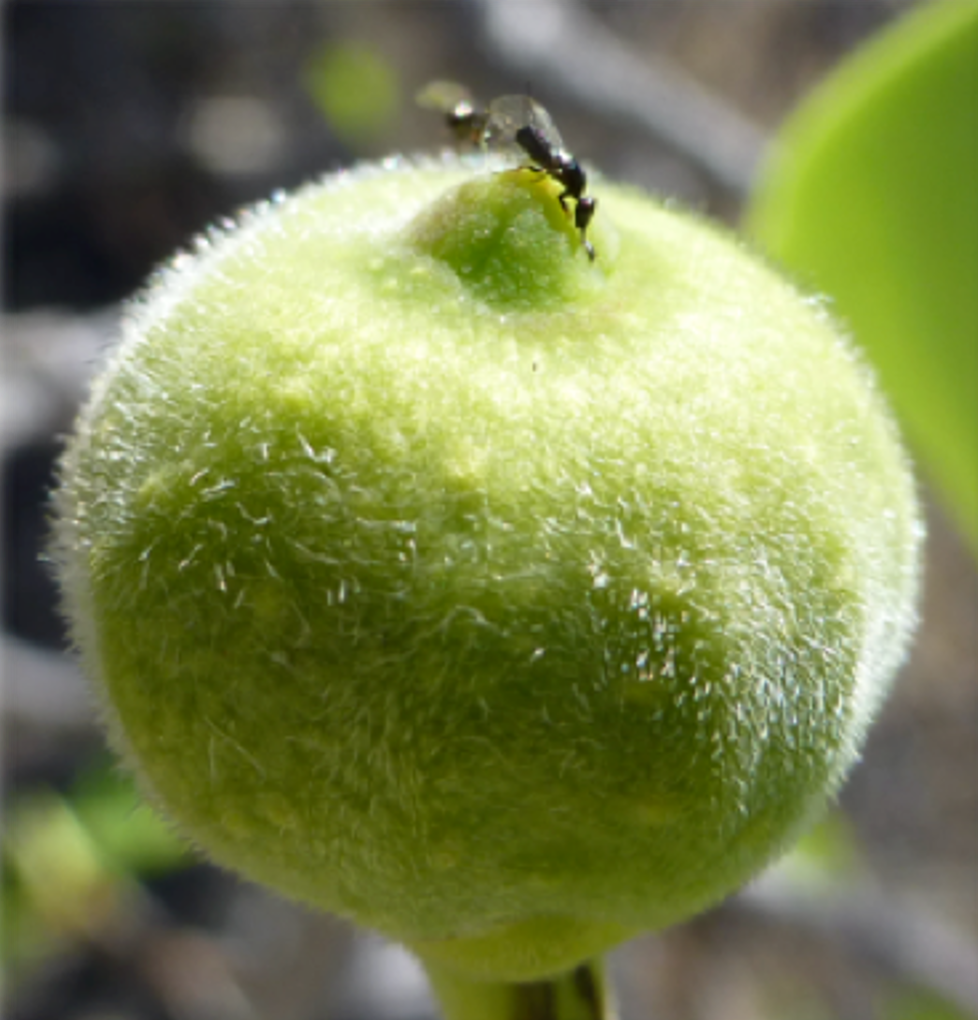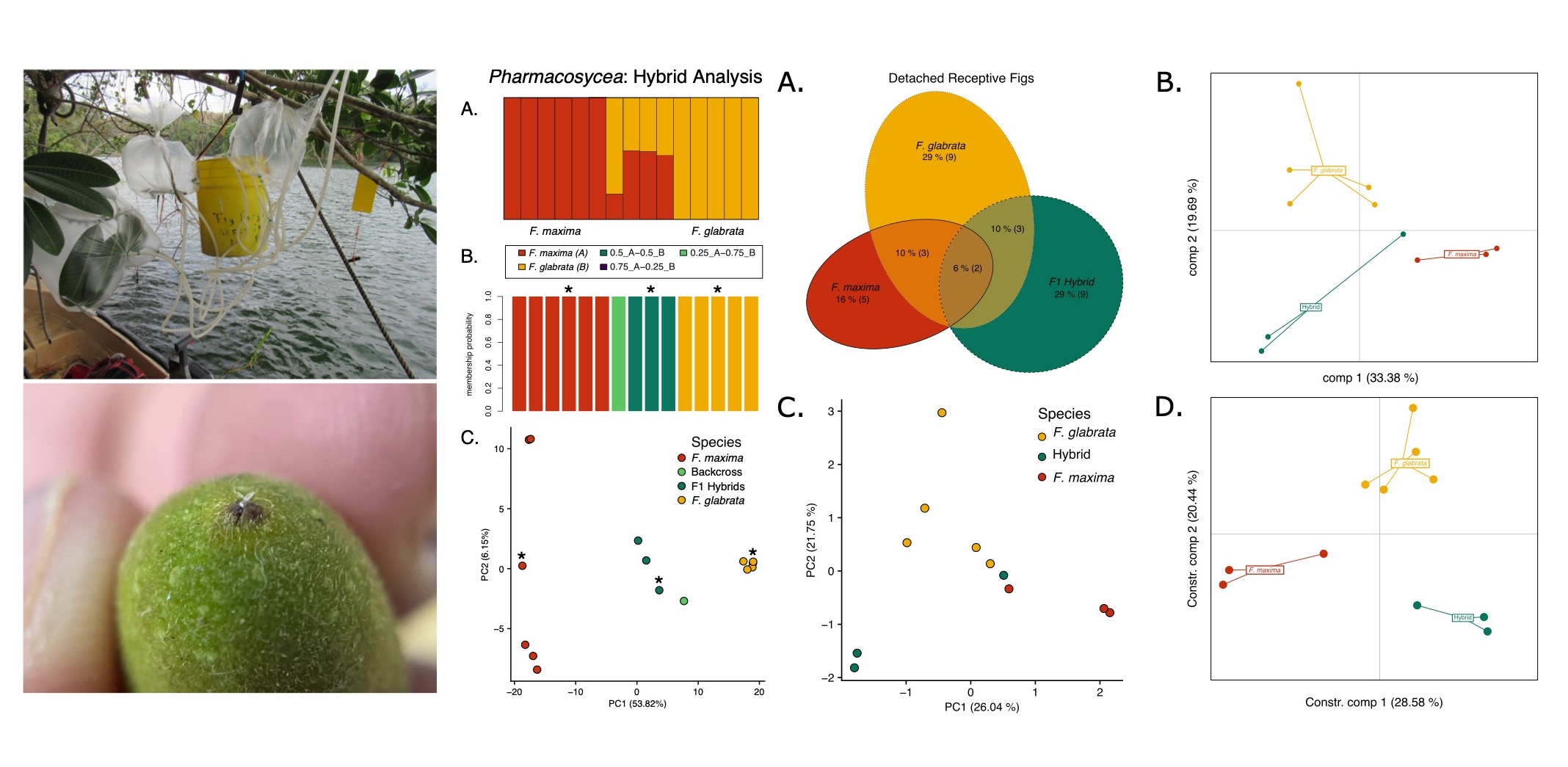 Receptive figs (Ficus) attract their highly host-specific pollinator wasps (family Agaonidae) using volatile organic chemicals. These chemicals vary in type and concentration among fig species and are thought to drive pollinator specificity. However, host switching and sharing among figs and wasps are increasingly recognized. We used genomic data to identify hybrid figs and compared the volatile chemicals they release with those of their parent species. Hybrids shared many compounds with their parents but also exhibited unique compounds not found in either parent (transgressive traits). This suggests that the flexibility of certain enzymes may enable hybrids to produce novel chemical scents. Future research integrating genetics and chemical composition may explain fig and wasp specificity and the evolution of speciation in this pollination mutualism.